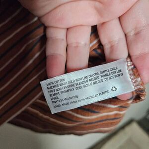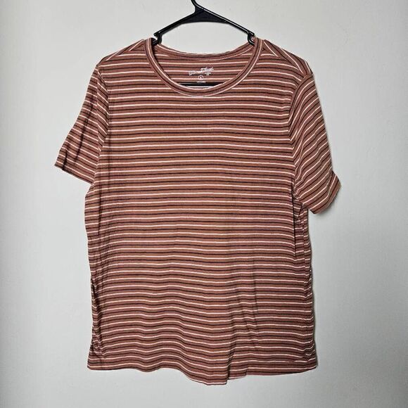 This is a short sleeved t-shirt by Universal Thread. It is orange with blue and white horizontal stripes.