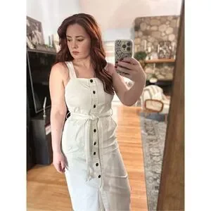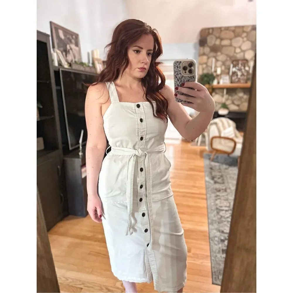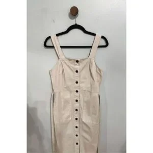 Universal thread trench dress || midi length || size medium but fits a little snug || good condition with some signs of wear (fading in small areas) || ties at waist || thick straps, could be worn in winter with a long sleeve tshirt as well ||