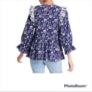 Universal Thread puff 3/4” sleeve ruffle blue blouse. NWT, size Medium. Blue and white floral print features 3/4” puff sleeves and embroidered ruffle details around shoulder and an 8” ruffle around the bottom. NWT size Medium. 53% cotton and 47% rayon.