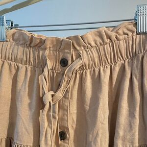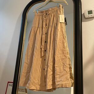 Tan Universal Thread linen blend midi skirt with tie waist and pockets. buttons down the front is such a nice detail. size small and brand new with tags. perfect for fall and thanksgiving #linenskirt