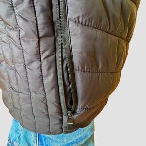 Quilted puffer vest, zip closure and side pocket, internal zip pocketplaid interior, upcycled University Montana Griz Applique on the back. Unique one of a kind piec