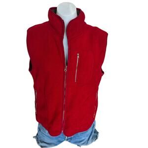 Red fleece vest, full zip closure, front and side pockets, fleece interior, upcycled University of Montana Grizzly Paw Applique on the back. Unique one of a kind piece