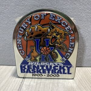 The University of Kentucky Basketball 100 Years 1903-2003 Collectible Golf Tin is a special edition tin celebrating the historic milestone of 100 years of basketball at the University of Kentucky. This collectible item pays tribute to the college's rich basketball heritage and is perfect for fans of the University and collectors of historical memorabilia. The tin serves as a unique keepsake for those passionate about the college's successful basketball program.