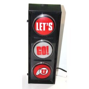 The University of Utah Football Team Utah Utes Flashing "Let's Go Utes" Traffic Stop Light Box is a 16-inch sign that features the official logo of the Utah Utes football team. The light box is plugged into the wall with a roll on / off switch. Blinks "Let's" then blinks to "go!" then blinks to the last light, then all three.