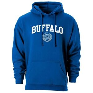 University of Buffalo Heritage hooded sweatshirt features "Buffalo" and Seal on front. Garment is a rugged 8.0 oz., feature draw strings on hood and pouch pocket in front, 50% cotton / 50% polyester. Color: Royal Blue. Manufactured and Officially Licensed by Ouray for Barnesmith.