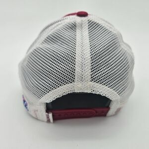 The Game University of Alabama trucker hat featuring a bold embroidered logo on a crimson cotton front and white mesh back. Classic snapback design with breathable comfort and adjustable fit. Excellent pre-owned condition with no stains or damage.