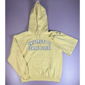 The University of Central Florida Champion Hoodie in adult size large is a stylish and comfortable sweatshirt featuring the UCF Knights football team's colors of yellow. This unisex hoodie is perfect for any fan of the team, with the Champion brand ensuring quality and durability. Show your support for the UCF Knights in style with this officially licensed fan apparel.