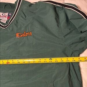 Show your team spirit with this Stylish green pullover jacket with Gators logo. Features striped banded collar, waist, and down sleeves. Also has a pull cord at waist for size adjustments, and side pockets.
