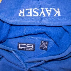 University of Kansas Hoodie size Small. Very small hole next to logo but otherwise in great shape. I am not sure who Kayser is. Feel free to offer! Rock Chalk!