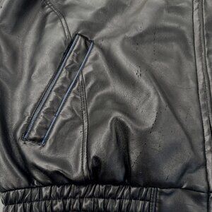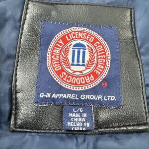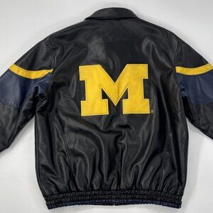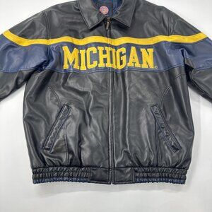 Vintage G-III University of Michigan faux leather bomber jacket for men, size large. Minimal wear. Zippers work great. No stains seen. Great, clean condition with some vintage surface crackling/slits in the material on the front, shown in photos. Does not cut through and is hardly noticeable at first glance. No odors. No stains seen. Smoke free/pet free. Please see all photos for complete details with measurements, and ask any questions.