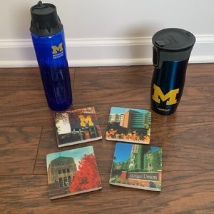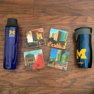 Set of 2 drinking cups. Taller, Michigan Medicine cup is plastic and has a twist top. The Contigo thermos cup is metal and good for holding hot contents.