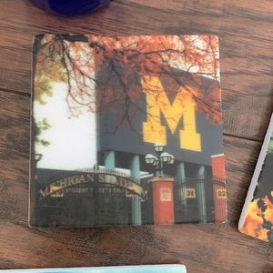 Set of 4 Coasters each with a different picture from campus. The coasters are super thick and heavy duty material with cork on the back to protect surfaces. These coasters have never been used.