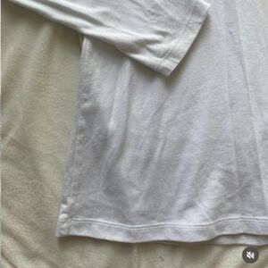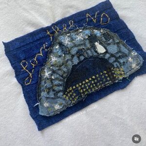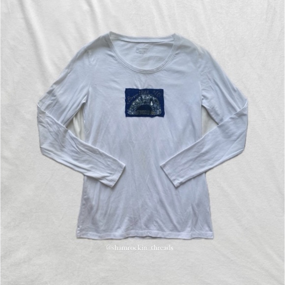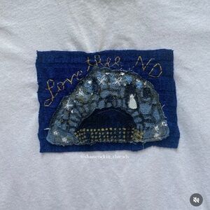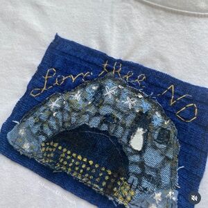 white, navy blue and gold “Love Thee Notre Dame” embroidered Grotto tee, size large. the coziest material ever! brand new. reworked and hand sewn by yours truly ✨🫶