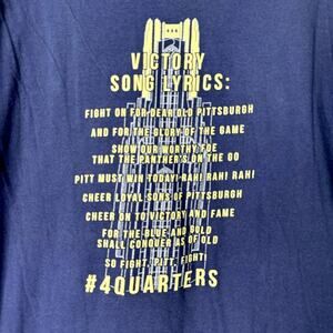University of Pittsburgh Pitt Panthers Victory Song Blue Gold T-Shirt Men's Size XL. The Panther Pitt Size navy blue with gold graphic short sleeve tee shirt. University of Pittsburgh Pitt Panthers Victory Song graphic on the back. Crew neck, short sleeve.