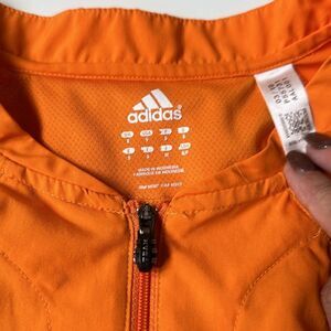 This university of Tennessee Lady Vols Coaches quarter zip is a rare find and has the power “T” and adidas logos on the front. The quarter zip pull over is polyester and a bright Tennessee orange. The hem has a cinching pull allowing you to customize the hem. Clean non smoking. There is no better time than now to support the Tennessee Vols! Limited edition rare the pit to pit measurement is approximately 21 inches and from the top of the shoulder to the hem is approximately 27 inches. No smoking. Zip front
