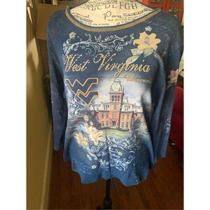 Lovely University of West Virginia t shirt with depiction of campus facility. No size tag but measures as a large.