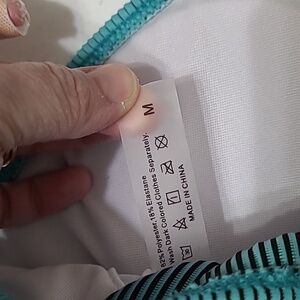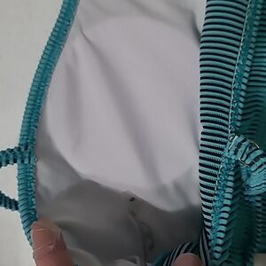 Unknown Brand women's Blue Ribbed Swimsuit Size Medium. Stylish blue ribbed swimsuit. Features unique side cutouts. Perfect for beach days. The middle section & upper back portion that aren't lined, will allow sunlight in.