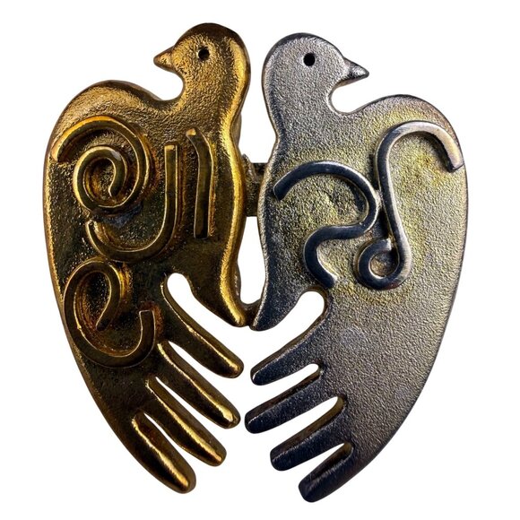 This Unknown Gender Mixed Metal Dual Bird Brooch features a striking gold tone and silver tone design with a signed artist's engraving on the back. With intricate artistic details, the brooch showcases two bird forms merging in an expressive style. Created in 2008-09, it combines functional use with artistic value. It’s the perfect blend of art, craftsmanship, and wearability.