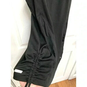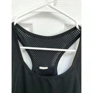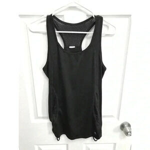 Black tank top with rouching on the sides with adjustable side ties. Really soft and cute! Quick dry material. Venting mesh on the sides. Tags removed but fits like a large.