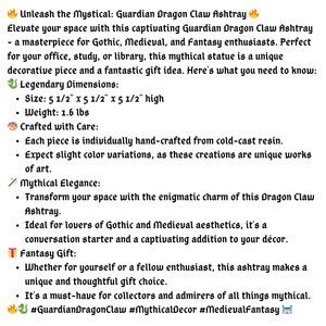 Elevate your space with this captivating Guardian Dragon Claw Ashtray - a masterpiece for Gothic, Medieval, and Fantasy enthusiasts. Perfect for your office, study, or library, this mythical statue is a unique decorative piece and a fantastic gift idea. Here's what you need to know:
