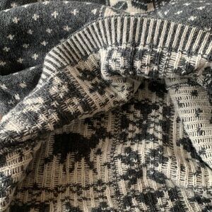 An oversized wool blend sweater from Canadian brand, Unlimited Quest Clothing. This gray and white ivory mock neck pullover knit is great for a long winter weekend at the cabin. The snowflake and deer design is perfect for weekends outdoors. Nordic or Icelandic design. Gently worn and in great condition. Men’s size large.