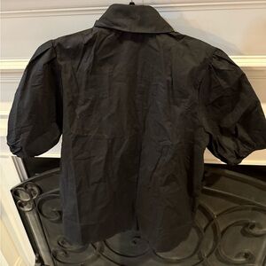 Stylish black button down shirt. Features puff sleeves and classic collar. Perfect for versatile wear.