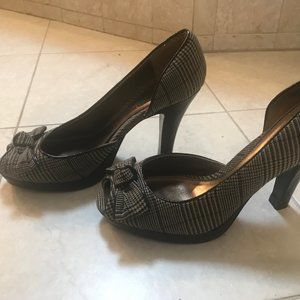 UNLISTED BROWN PLAID PEEP TOE PUMPS W/BOW - SMALL PLATFORM
