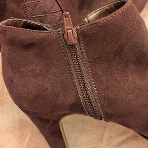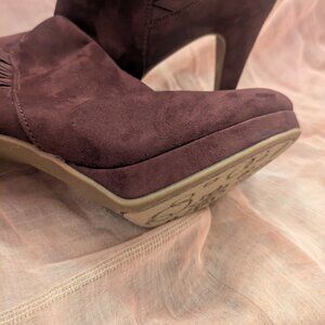 Unlisted By Kenneth Cole Plumberry Boots 8.5 Ankle Bootie Purple Suede Platform Stiletto with side zip.The deep purple suede and sleek ankle bootie design make them perfect for pairing with jeans, skirts, or dresses. See second photo for accurate color - please note: the second photo is a different model/style but it accurately shows you the color of these boots. Elastic inserts on the side are decorative AND functional - you'll be comfortable all day and all evening. 4-inch heel. See close up of soles - no wear or scuffs. There is no made-from materials label - these feel like real suede but you be the judge!