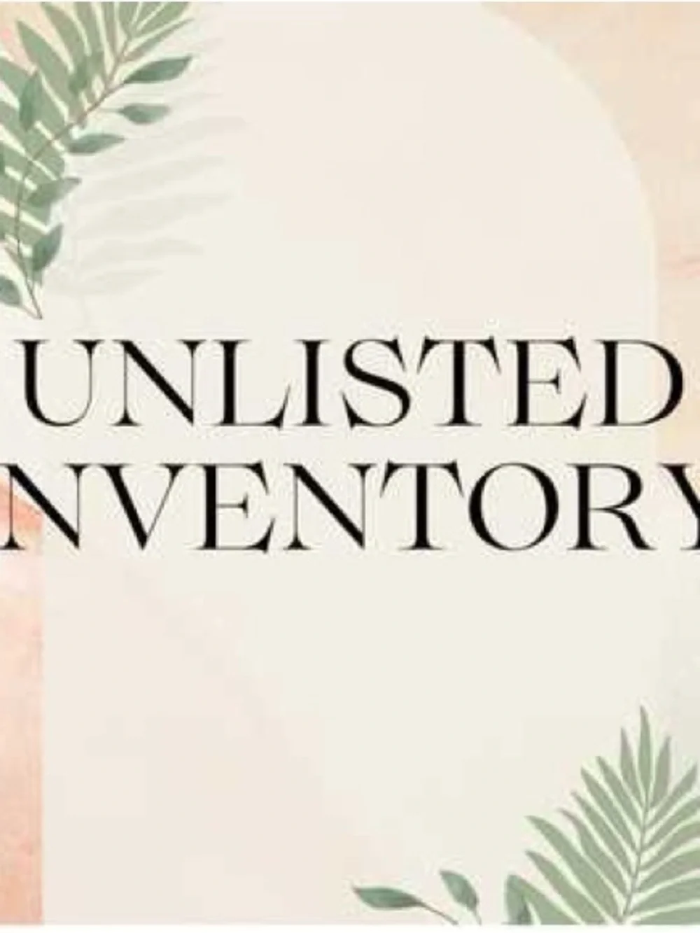 Decorative graphic banner with large serif text reading 'UNLISTED INVENTORY'. Soft cream background with muted peach accents. Green botanical leaf illustrations on corners. Clean, modern aesthetic.