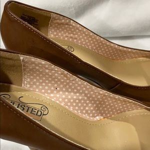 Cute brown pumps that go with multiple outfits. Only tried on and never ended up wearing them. Make offer. Great condition. Manufacturers imperfection on toe-see pic.
