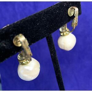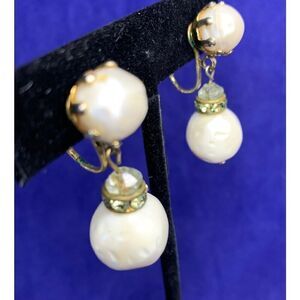 Unmarked Textured Faux Pearl Earrings with Crystal and Clear faceted Rhinestones adorning the one below set in Gold plate,; top Pearl is well pronged and set in clip style