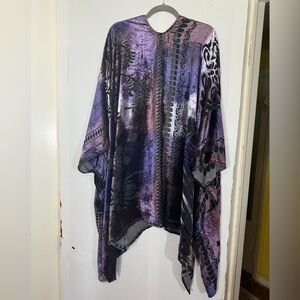 Deep Purple. Stylized purple velvet creates a rich contrast to the black burnout designs on this elegant open-front kimono. Sheer gossamer drapes to the arced hemline. Kimono sleeves. Polyester/viscose. Machine wash. Imported. One size fit most: 32" long, center front.