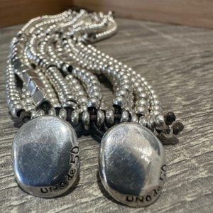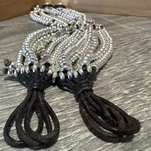 UNO de 50 Trivial Bracelet Super Rare Retired Leather Silver Double Closure in like new condition. This bracelet will take your breath away! Handcrafted in Spain, this masterfully woven leather and silver bead combination bracelet is of luxurious quality. 12 rows of refined round and square silver plated beads pair perfectly with the rawness of the top grade leather strands. There are 2 large silver button-like closures to close the bracelet. Length 7”. Approximately 2.5” wide.