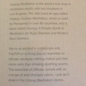 Brand new, never used, and in its original packaging. Essential oil diffuser that changes colors and comes with Unplug’s orange oil called “Happy”. I am also throwing in an extra bottle of orange and a bottle of eucalyptus from the brand Wayofwill. The diffuser is white and changes into light pastel colors when activated.