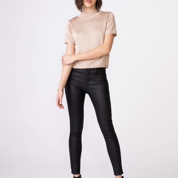 Lean and sexy, this high waist skinny will hug you just right in our soft, super stretch quality vegan leather. This style hits right at your natural waist is fitted through the hips and thighs and has a slim leg. This twill fabrication has a matte black coating for a leather-like look creating a rich black shade. 5-pocket styling with a button and zip fly closure. Blackened brass hardware with tonal stitching. Elongate those legs with this ankle-length cut.