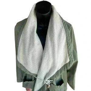 Unpublished women’s asymmetric fur fully lined navy green front pockets around waist ties 100% cotton super cozy jacket perfect for the chilly fall weather