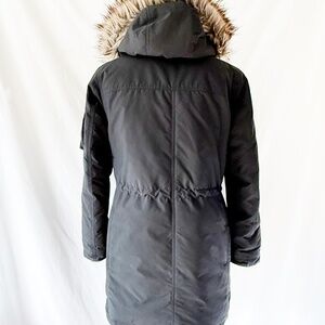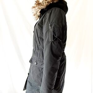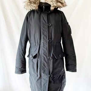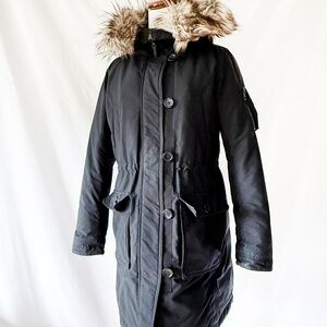 Heavy duty down jacket for winter from Uniqlo. Removable faux fur trim. Zipper and buttons to close, pockets all over, I wore this to the North Pole 2x and It kept me nice and warm both times. Just a bit small for me now otherwise I would continue to wear it. Waist can be cinched with inner pull cord. This could use a dry cleaning just to brighten her up and get that makeup stain off the collar. No holes, no unremovable stains. 32" long from top of shoulder to hem I could never decide if this is back or very dark blue. I think it's more of a very dark blue.