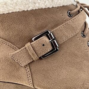 These wedge booties with faux-fur lining and a lace-up front are in good condition. They also feature a side zipper and an adjustable buckle strap. There's some water spots on the base of the heel. See photos for details.