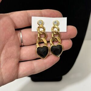 Unsigned Black Heart Gold Tone Chunky Chain Dangle Drop Earrings Pierced 80s 90s