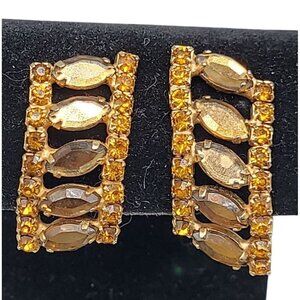 Vintage clip-on earrings featuring topaz and citrine crystals. Unsigned designer piece with a unique ladder/climber style, perfect for adding a touch of elegance to any outfit.
