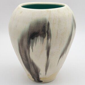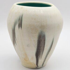 This unmarked vase has all the signs of being vintage studio pottery, from its slightly uneven shape to the striations on the bottom and the uneven drip glaze on the matte exterior. It is a cream color with abstract brown and tan markings (some of which fade into a hint of blue), and the interior is a glossy turquoise blue color.