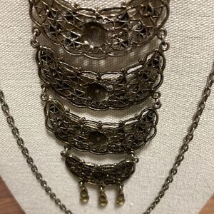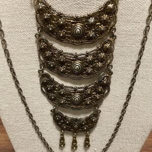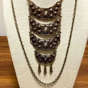 Unsigned Goldette vintage gold tone statement necklace with 4 decorated crescent pendants on double open link chain with beautiful fold over clasp.