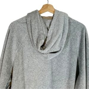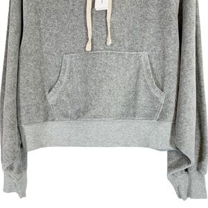 Features: Super soft velour style cotton blend fabric in heather gray color. Drawstring hoodie. Front kangaroo pouch Pocket. At waist fit. Pull over.