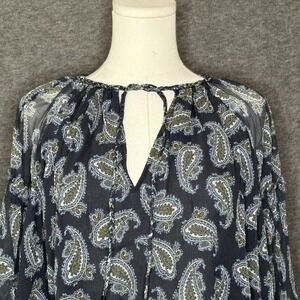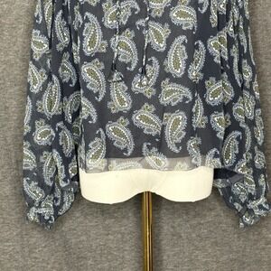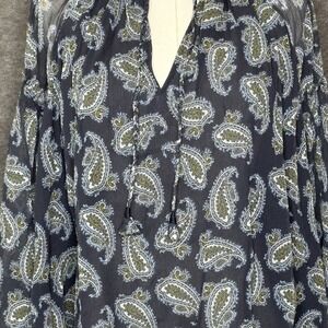 100% Silk - Semi Sheer - Paisley Print in Green, White, Blue - Drawstring neckline