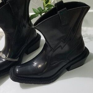 Lightning bolt design, chain detail on the right boot, unique square heel and avant garde profile, metal buckles under the soles, these boots have been worn once. Size 37. Materials are high grade vegan leather, heavy, silky, expensive to the touch.