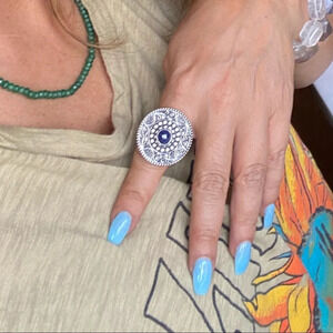 Untreated Sapphire silver big mandala disc oversized ring /maximalist/bohemian