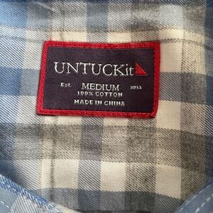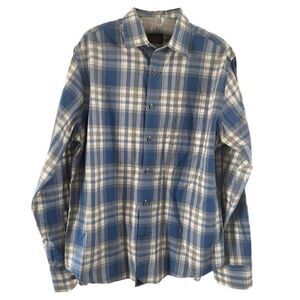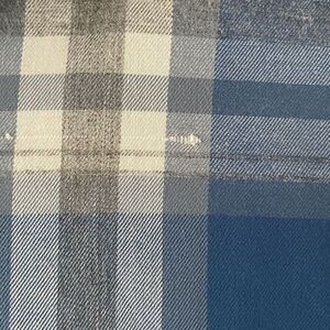 Collared with a button up front closure. Long sleeves. Soft 100% cotton. Plaid pattern in blue, white & grey.