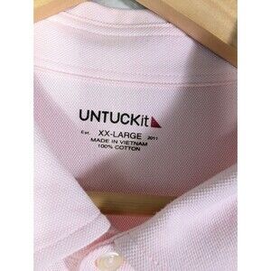 This is a men's Untuckit button-up shirt in light pink, size 2XL. It features a solid knit fabric made of cotton with long sleeves and a collared neckline. The slim fit design includes button closures and accent details. The shirt is described as being in excellent used condition.