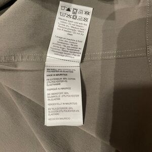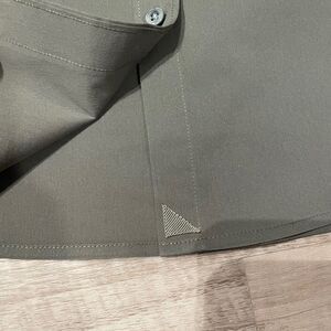Women's wrinkle resistant olive green button down shirt from Untuckit, size 8. This tailored shirt has a collar, bust darts and a slightly curved hem for a flattering fit. This work staple can be worn tucked or untucked for a more formal or casual look. It's made of a fabric blend that is 65.5% Cotton, 30% Polyester, 4.5% Elastane that is wrinkle resistant and relatively opaque. Excellent used condition, no flaws. Pit-to-pit measures 20 inches and length measures approximately 26 inches.approximately