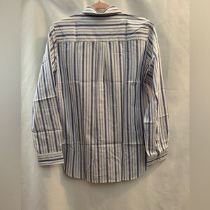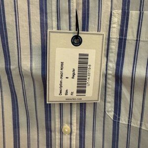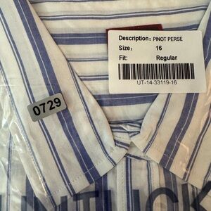 This Untuckit Pinot Perse Long Sleeve Button Down Shirt is brand new and in original packaging. It is blue and white vertical striped. The blue kinda has a purple hue to it. It is a regular fit which their website says runs smaller than other brands.